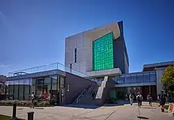 Development accelerated after Wallace Loh became the president of the University of Maryland in 2010 and relations between the university and the city improved.[25] It was recognized that the university could not compete if the students, faculty, and staff could not live in College Park[26] so the Greater College Park initiative, a $2 billion public-private investment to revitalize the community around the university aiming to create one of the nation's best college towns, was launched in 2014.[9] Some of the developments that occurred as a result of this initiative included the 4-star Hotel at UMD in 2017 and the Cambria in 2018, the first hotels built in the city in over half a century,[25] and the construction of the College Park City Hall in 2021, a joint venture between the city and the university that provides offices for both as well as retail space and a public plaza.[27] This plaza holds music performances, markets, and city events throughout the year[28][29] that contributed towards the revitalization of College Park's downtown.[30] The university also launched the Discovery District, its business and research park,[31][32][12] and promoted several mixed-used apartment high-rises such as the Aster (2022) or the Union (2024) that brought along new restaurants, shops, and grocery stores.[33][34][13]
