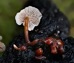 The gills are adnate (bluntly fused to the stem), becoming subdecurrent with age (running slightly down the length of the stem). The gill spacing is close to subdistant, and the individual gills are whitish to pinkish-buff, thin, narrow to moderately broad, and have straight edges. The stem is 10–50 mm (0.4–2.0 in) long by 1–2 mm (0.04–0.08 in), and roughly equal in width throughout its length. It is slender and thread-like, flexible and pliant, with a dry surface. The top of the stem is covered with scales or a fine whitish powder, while the lower portion has hairs ranging from delicate to coarse. The color of the stem is generally whitish to pinkish-buff, but it darkens after it has been handled. The stem interior is pithy, and becomes hollow with age. The stems originate from a dark reddish-brown sclerotium of variable shape, typically measuring 3–12 mm (0.12–0.47 in) by 2–5 mm (0.08–0.20 in). The surface of the sclerotium is initially smooth, but later becomes wrinkled or furrowed; its interior is solid and white.[13] It is often compared to an apple seed in appearance.[12][16] Typically, several sclerotia are connected by thin strands of mycelia.[12] The sclerotium is a resting structure that allows to fungus to overwinter in its host.[17] In 1915, William Murrill reported the sclerotia of C. tuberosa to be bioluminescent.[18]