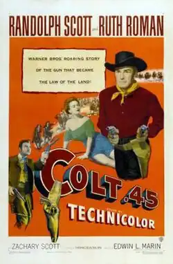 Colt .45 is a 1950 American Western film directed by Edwin L. Marin and starring Randolph Scott, Ruth Roman and Zachary Scott.[3] Reissued under the title Thundercloud, the film served as the loose basis for the television series Colt .45 starring Wayde Preston, which premiered seven years later. Written by Thomas W. Blackburn, author of the lyrics to The Ballad of Davy Crockett, the film is about a gun salesman and gunfighter who tracks down a killer who stole two new Colt .45 repeating pistols leaving a trail of dead bodies behind him. The revolvers used in the movie were actually first model .44 Caliber Colt revolving belt pistols made in 1849 and reaching final form by 1850. Scott correctly demonstrated how to load them so the producers of the film were most likely aware of the anachronism in the title.