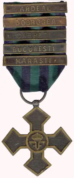 The Commemorative Cross of the 1916–1918 War (Romanian: Medalia Crucea Comemorativă a războiului 1916-1918) is a Romanian First World War campaign medal established on 8 July 1918 by Royal Decree.[1] The Decree was amended four times, in 1919,[2] 1920,[3] 1927[4] and 1939.[5]