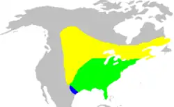 | Approximate range in North America Breeding range Year-round range Wintering range