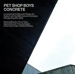 Concrete is a live album by English synth-pop duo Pet Shop Boys, released on 23 October 2006[1] as a double CD. It was the duo's first live album.[2] The concert was recorded for broadcast on BBC Radio 2 in May 2006, with accompaniment by the BBC Concert Orchestra and special guests including Frances Barber, Rufus Wainwright, and Robbie Williams.[3]