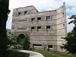 Adjacent to the Johnson Art Museum is a pedestrian suspension bridge (1960) designed by Dean S.C. Hollister and William McGuire. It replaces an earlier version constructed in 1913.[88] Adjacent to the dam is another pedestrian bridge which was originally constructed to serve the trolley lines.