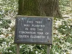 A plaque marking a tree planted in the United Kingdom to commemorate the coronation of Queen Elizabeth II