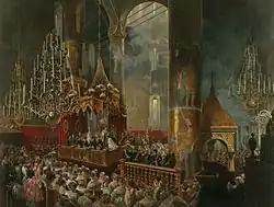 Coronation of Tsar Nicholas II and Empress Alexandra Feodorovna in 1896. Nicholas' mother, Dowager Empress Maria Feodorovna can also be seen seated on the dais at left.