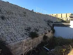 The Corradino Lines were therefore built by the Royal Engineers between 1871 and 1880, at a total cost of £17634. Part of the megalithic temple of Kordin II was destroyed to make way for the new line of fortification in 1871.[5] The defensive line consisted of a V-shaped polygonal-style trace surrounded by a ditch, stretching all the way from the Cottonera Lines to the Ras Ħanżir polverista.[6] The lines were also meant to protect the polverista, which was modified by the addition of an enclosure pierced by musketry loopholes.[7] The lines were armed with two RML 64-pound guns.[8]