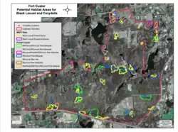 At Ft. Custer Training Center (FCTC) in southwest Michigan, C. flavula was found when an armory was being constructed in 1995. This led to Michigan Department of Military and Veterans Affairs to seek a permit from the Michigan Department of Natural Resources for the take of the plant during the construction of the building. The permit required ten years of monitoring along a transect in a black locust dominated area near the armory construction. At the end of the ten years it was determined that further surveys needed to be conducted elsewhere on the installation, not only because it was apparent the plant occurred elsewhere on the 7,500 acre property, but also because there was the threat of more take due to new construction in 2012.[4] The embedded map shows the potential habitat considered viable in the 2010 consideration of where to survey to manage the construction threat in 2012.[5]