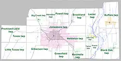 Townships in Arkansas are the divisions of a county. Each township includes unincorporated areas; some may have incorporated cities or towns within part of their boundaries. Arkansas townships have limited purposes in modern times. However, the United States census does list Arkansas population based on townships (sometimes referred to as "county subdivisions" or "minor civil divisions"). Townships are also of value for historical purposes in terms of genealogical research. Each town or city is within one or more townships in an Arkansas county based on census maps and publications. The townships of Craighead County are listed below; listed in parentheses are the cities, towns, and/or census-designated places that are fully or partially inside the township. [24][25]
