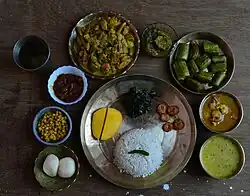 The cuisine of Odisha is the cuisine of the Indian state of Odisha. Compared to other regional Indian cuisines, Odia cuisine uses less oil and is less spicy, while nonetheless remaining flavorful.[1] Rice is the staple food of this region. Mustard oil is used in some dishes as the cooking medium, but ghee (made of cow's milk) is preferred in temples. Odia foods are traditionally served either on brass or bronze metal plates, banana leaves, or disposable plates made of sal leaves.[2]