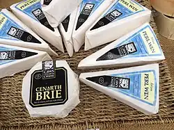 Caws Cenarth is a cheese made at Pontseli near Boncath since 1984, the cheese is sold locally and at Selfridges and has been listed by Harrods as a Top Ten British Cheese. Llangloffan Farmhouse Cheese was produced on a smallholding near Llangloffan by Leon Downey and his wife Joan. He was a former principal viola player with The Hallé.[33] Downey retired in 2006 and his Llangloffan cheese is now made by the Carmarthenshire Cheese Company. Pant Mawr Farmhouse Cheeses, based at Clynderwen, in the Preseli Hills, offers hand-made award-winning cheeses, including Caws Cerwyn, a mellow short-matured cheese, Mature Cerwyn, which is full-bodied, Oak Smoked Cerwyn, which is a traditionally smoked cheese, Caws Preseli, with a distinctive taste, and Dewi Sant, with a tangy yeasty taste. Their Caws-y-Graig cheese is a goat's cheese with a robust flavour.[31] [34]