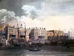 With the growth of trade, the opening of the docks, and the increases in duties during the Napoleonic wars, larger premises became necessary in the early nineteenth century. To meet this need, a new building to the designs of David Laing was begun in October 1813, on a site immediately to the west of Ripleys's building,[1] where Bear Quay, Crown Quay, Dice Quay, and Horner's Quay had once been.[2] Laing had held the position of surveyor to HM Customs since 1810.[3] On 12 February 1814, the old building was destroyed by fire, resulting in the explosion of gunpowder and spirits. As a result, papers were retrieved from as far as Hackney Marshes.[1]