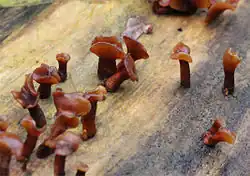 The fruit bodies have upside-down cups 3–15 millimetres (1858 in) across. Similar species include Guepiniopsis buccina and some in Auricularia.[4]