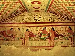 The frescoes found in many Etruscan necropolis depict the Etruscans in the splendor of the Triclinium banquet, drinking and eating with opulence (also evident in the lids of the figurative sarcophagi). The frescoes show the richness of the crockery and everyday objects (such as dice) found in the tombs, accompanying the deceased into the afterlife with the memory of their earthly life.