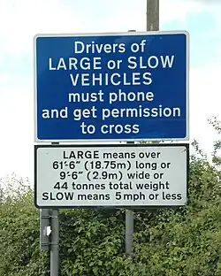 Currently (2025), the regulations concerning slow vehicles dictate that any vehicle or other transport that cannot completely cross the level crossing within 15 seconds (12 seconds for crossings without active warning signals) isn't allowed to cross, except with prior permission from ProRail, which must be requested at least five working days in advance.[18] It's recommended to avoid such crossings whenever possible.