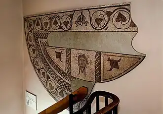The large mosaic depicting the Medusa was transferred to the Yorkshire Museum, where it was on display by 1881 in the Hospitium.[2] The mosaic is currently on display in the museum, where it is affixed to a wall next to a staircase.[4]