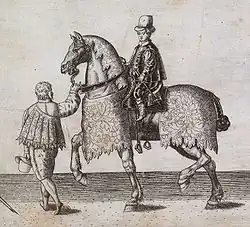 Daniel Bacheler (on horseback) from an engraving by Thomas Lant of the funeral procession of Sir Philip Sidney in 1586