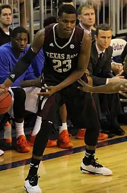 House transferred to Texas A&M and received a waiver from the NCAA to immediately play rather than sit out a year.[4] He averaged 16.2 points per game and earned first-team All-SEC honors. House suffered a foot injury near the end of the season and missed the team's final four games. During his senior season, House averaged 15.6 points, 4.8 rebounds and 2.1 assists per game and scored at least 20 points in nine games. For the first three games of the season, House scored a total of 50 points in wins over USC Upstate, Southeastern Louisiana, and Texas A&M-Corpus Christi. The Aggies went to the Battle 4 Atlantis finals, losing to Syracuse 74–67. Along the way, the Aggies beat former rival Texas and upset No. 10 Gonzaga with House scoring 19 in each contest. The Aggies finished the regular season with 13 wins, sharing the SEC championship with Kentucky. In the SEC tournament, House averaged 17.0 points per game and scored 32 in the championship game against Kentucky, where the Aggies lost 82–77 in overtime. In the first round of the NCAA Tournament, House scored 20 points in 26 minutes to defeat the Green Bay Phoenix 92–65. In the second round, the Aggies faced the #11 seed Northern Iowa Panthers. By the 5:14 mark in the second half, House had not scored any points[5] and ended with 22 in a double-overtime game where the Aggies overcame a 12-point deficit with 44 seconds remaining in regulation to win 92–88. It was the largest last-minute comeback in NCAA basketball history.[6]