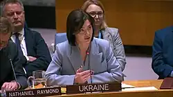 In December 2024, Zarivna spoke at the UN headquarters in New York, where she presented a report on Russia's war crimes in Ukraine.[25] She demonstrated to members of the UN Security Council how Russia forged documents on Ukrainian children to destroy their identities.[25] Zarivna showed the birth certificate of Margarita Prokopenko, who was 10 months old when she was forcibly deported from the Kherson baby home, illegally adopted, her name changed and her place of birth falsified.[25] Inna Varlamova, the wife of Russian politician Sergey Mironov, organised the girl's move to Moscow.[25] During her speech, she also drew attention to the illegality of Russia's membership in the UN Security Council.[26] According to Zarivna, "Russia's imperial exhibitionism must be put to an end".[26]