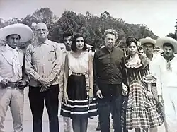 Siqueiros was a member of the Mexican Communist Party. Although he went to Spain to support the Spanish Republic against the forces of Francisco Franco with his art, he volunteered and served in frontline combat as a Lieutenant Colonel in the Army of the Republic through 1938 before returning to Mexico City.[2] In 1940, he led a failed assassination attempt on Leon Trotsky in which Trotsky's 14-year-old grandson was shot and American communist Robert Sheldon Harte was executed.[3][4][5] After spending several months on the run from Mexican authorities disguised as a peasant, Siqueiros was eventually apprehended in Jalisco, although he would never be brought to trial and was freed shortly.[6]