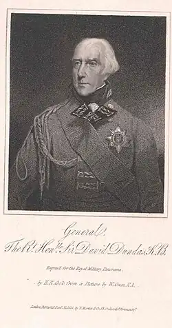 General Sir David Dundas GCB, PC (1735 – 18 February 1820) was a British Army officer who fought in the Seven Years' War and French Revolutionary Wars, wrote important texts on the Principles of Military Movements and then served as Commander-in-Chief of the Forces from 1809 to 1811.