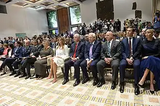 David Friedman, fourth from right in the front row of an assembly at the Beit HaNassi (the President's Residence of Israel), during Donald Trump's visit to Israel, May 2017