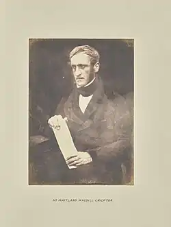 David Maitland Makgill Crichton (4 March 1801 – 11 July 1851) was a Scottish lawyer who inherited his father's estate at Nether Rankeilour in Fife to become a country gentleman. He played an important role in the formation of the Free Church of Scotland and consequently was photographed by Hill & Adamson. He organised a local committee to start the Fife Sentinel newspaper. Following his death a memoir of his life was published, written by J. W. Taylor, a Free Church minister from Fife. His statue overlooks the South Bridge in Cupar.