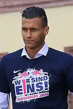 Selke made his debut for RB Leipzig on 25 July 2015 against FSV Frankfurt and scored his first goal for the club the following week, netting in a 2–2 draw with Greuther Fürth.[17] On 21 November, Selke netted the only goal in a 1–0 win over Arminia Bielefeld which saw Leipzig climb to the summit of 2.Liga.[18] On 8 May, Die roten Bullen secured promotion with a match to spare after beating Karlsruher SC 2–0. It was the first time in the club's short history that they had been promoted to the Bundesliga.[19] During the post match celebrations, Leipzig manager Ralf Rangnick pulled his hamstring after being chased by Selke with a glass of beer.[20] He finished the 2015–16 season with 10 goals in 32 appearances.[21]