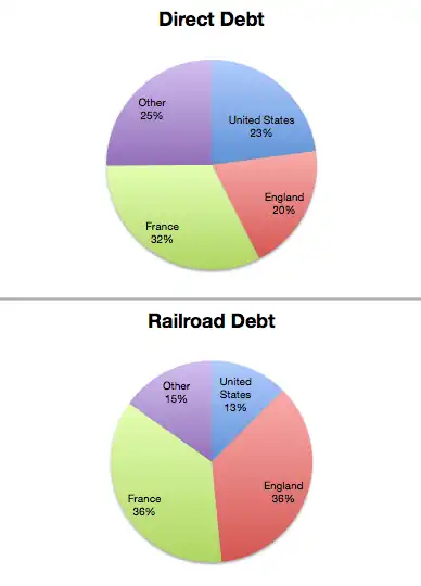 The amount of direct debt held was 22.9% United States, 19.6% United Kingdom, and 32.4% France. The railroad debt was also mostly in foreign hands: 12.5% United States, 35.9% United Kingdom, and 36.4% France.[5][9][12]