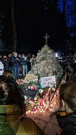 Russians began bringing flowers to monuments to victims of political repression in cities across the country.[88] Russian human rights group OVD-Info initially reported that by 17 February, more than 400 people had been detained by authorities in over 36 cities for taking part in the gatherings; the number was later corrected to 366 people.[89][90] Among those arrested was a priest who intended to hold a mass for Navalny and subsequently suffered a stroke while in police custody.[90][91] In some cities, flowers were removed and the police took photos of people laying flowers in memory of Navalny.[92][93] People laid flowers at Moscow's Solovetsky Stone and the Wall of Grief.[94] The Moscow Prosecutor's Office warned Russians against mass protests.[95] In Saint Petersburg alone, 154 people were sentenced to 14 days' imprisonment for violating anti-protest laws.[96] At least six of them were reportedly issued military draft notices upon their release.[97] Russian digital map company 2GIS reportedly blocked reviews of memorial sites after people used the service to write about memorials for Navalny.[98]