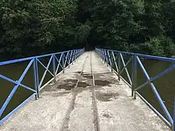 The Decauville railway with a gauge of 600 mm (1 ft 11+58 in) ran from the quarries to the forges and offices at the railway station, near which other metalworking factories and electric motor works were opened up via the narrow-gauge railway around 1932.[6][7] The Decauville railway was operated with steam locomotives and numerous tipping lorries. Remains of the tracks are still preserved on the embankment that divides the lake into two parts. In the newly created park on Rue de la Gare, the park paths follow the route of the former light railway.[8]