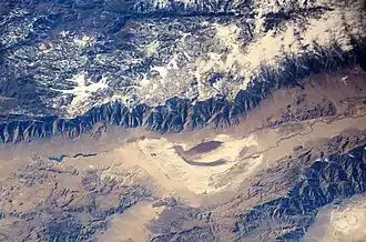 California's Sierra Nevada Mountains (formed by delamination) as seen from the International Space Station. When a large portion of dense materials was removed under the tectonic plate at this location, the remaining portion of the crust and lithosphere underwent a rapid uplift forming this mountain range.