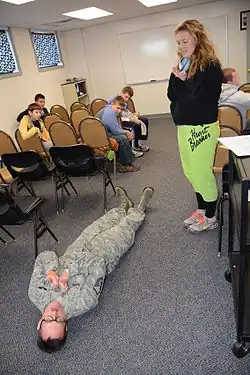 Master Sgt. Robert Burns demonstrates to a Delaware Wing CAP cadet how to play a victim during a mass casualty exercise.
