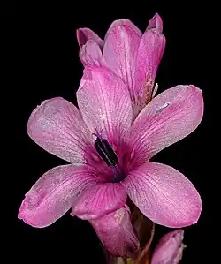 Dierama igneum, the fiery wandflower, is a species of flowering plant in the iris family Iridaceae, native to south east Africa.[1] It is a slow-growing,[2] bulbous perennial growing to 1 m (3.3 ft) tall from clumps of grass-like leaves. Evergreen in its native Africa, it may become herbaceous in colder regions. The trumpet shaped flowers are borne on long, arching stems, and are normally salmon pink in colour. The specific epithet igneum, meaning "glowing" or "fiery", may refer to these arching sprays of blooms.[2]