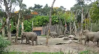 The elephant's area is called 'Het Rijk der Reuzen'. The inside exhibit opened in 2009, and is with around 750 m2 the biggest inside exhibit in the Netherlands,[5] and the third largest of Europe. The 3300 m2 outside exhibit opened 6 June 2010.[6]