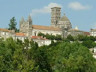 The religious monuments of the province of Angoumois are remarkable for their admirable Romano-Byzantine façades. The most beautiful of them is St. Peter's Cathedral at Angoulême. The original cathedral was dedicated to Saint Saturninus, but it was destroyed by the Arian Visigoths. After the defeat of Alaric II in 507, King Clovis had his chaplain Aptonius made bishop and had the cathedral rebuilt and named in honor of Saint Peter.[4] It was consecrated around 570, according to tradition by Saint Germain, Bishop of Paris. The cathedral was ravaged again, this time by the Normans, in the middle of the ninth century. It was rebuilt by Bishop Grimoard and dedicated in 1017. The present edifice is the work of Bishop Gérard II de Blaye, the Papal Legate, ca. 1109–1120.[5] The cathedral was administered by a Chapter, composed of a Dean, the Archdeacon, the Treasurer, and twenty-one Canons. There were also a Cantor and Scholasticus, but they did not have a vote in Chapter unless they were also Canons.[6]