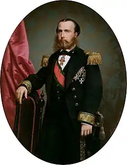 After occupying Veracruz, the Spanish and British agreed to withdraw on April 9, 1862 in return for Mexico using 80% of the port's custom revenues to settle the debt.[71] Realizing that the United States would not intervene while the Civil War was being fought, the French stayed and on April 16 invited Mexican conservatives to join them in establishing a new government. On June 10, 1863 the French occupied Mexico City and named a government Junta that proclaimed Mexico a constitutional monarchy and invited archduke Maximilian of Austria to become emperor of Mexico.[88] With the new monarchy, the French planned to stop U. S. expansion and secure economic dominance over Mexico and the rest of Latin America.[70] The United States and most Hispanic American countries protested the proclamation of the empire, and the leaders of El Salvador, Bolivia, and Chile requested U. S. intervention against the French.[89] The Confederate States approved the monarchy in hopes that this would gain them French recognition, but Napoleon III remained noncommittal without British support, and in 1864 he vetoed a mutual recognition of the Confederate States and the Second Mexican Empire in order to not drag France into a war with the United States.[4]