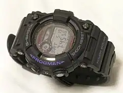 As of May 2019, the record for the deepest normally functioning experimental diving watch is held by the Omega Seamaster Planet Ocean Ultra Deep Professional after reaching a (revised) depth of 10,925 ± 4 m (35,843 ± 13 ft) of seawater during a descent to the bottom of the "Eastern Pool" of the Challenger Deep by the Five Deeps Expedition.[67][68][69] Two of these watches were attached to the outside of the Deep-Submergence Vehicle Limiting Factor: one on each of the main vessel's robotic arms and an additional one on the ultra-deep-sea lander Skaff.[70] Due to a technical problem the watch fixed to the ultra-deep-sea lander stayed on the bottom for two days before it and the lander were salvaged from an unrevised depth of 10,927 m (35,850 ft).[71][72] The normal surface air filled watch case is made of (DNV GL certified) forged grade 5 Titanium alloy (same as the hull of the DSV Limiting Factor) has a 55 mm (2.17 in) diameter and is almost 28 mm (1.10 in) thick and has been tested and certified for up to 1500 bar/15,000 m (49,213 ft).[73]