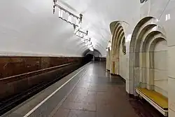 The station has a pylon trivault built in the flamboyant architecture style of the late 1940s — early 1950s. Architect Leonid Popov and co-authors M. Zelenin and M. Ilin based their design on themes inspired by the city of Serpukhov, with the overall design referring to ancient Russian architecture and in particular the Church of the Intercession on the Nerl, which is repeated in the design of the portals and the beige marble composition.