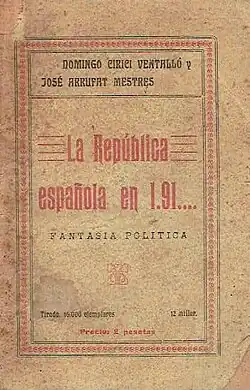 In 1911 Cirici and José Arrufat Mestres released La República española en 1.91...,[73] the novel next year followed – this time authored by Cirici only – by sort of a sequel, Memorias de Muñoz Villena.[74] Both books were political pamphlets aimed against the Left and featured Spain of the near future. The monarchy was toppled and replaced with a republic, ran by a republican-socialist coalition; it declared agrarian reform and official atheism, banning public Catholic cult; as growing chaos and separatism produced collapse of public order, a rebellious general staged a coup intended to save the country. The narratives featured numerous real life personalities, usually set in sinister roles of cynical political manipulators:[75] Lerroux, Alvarez, Galdós, Largo Caballero, Weyler, Iglesias, Romanones, Azcárate, Alcalá-Zamora, Besteiro and many others, though the rebel general was a fictitious person.[76] A few episodes might have seemed off-limits, e.g. Galdós as president of the republic was killed in an assassination attempt.[77]