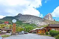 It is in the mountainous region of the state and is marketed as the "Green City", since it is surrounded by subtropical rainforest, much of which has disappeared in the rest of the region. Within its borders lie mountains of up to 2000m, amongst which is the well-known Pedra Azul State Park consisting mainly of a quartzite rock jutting out of the surrounding landscape at 1,822m above sea level. It has a blue tinge to the stone due to the kind of lichens which grow on it, which gives the name to the formation and the park.