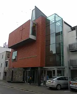 At street level the church protrudes onto the pavement and is constructed of squared cut knapped flint; the upper storeys are constructed in red brick and concrete with large areas of glass and a mostly tiled exterior.[7][3] The interior has many rooms and configurations, and the top floor is partly lit by a glass-faced tower. The design, created by a Worthing-based firm, won a local award in 2003.[5]