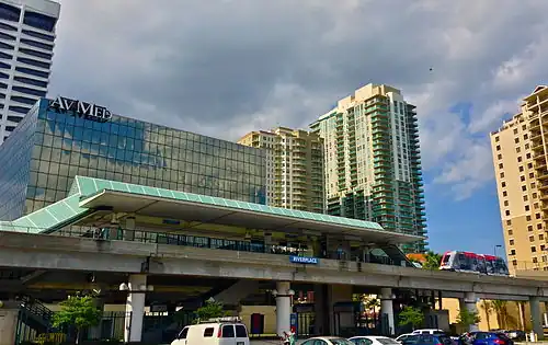 Downtown is served by the Jacksonville Transportation Authority's zero-fare automated people mover system (known as the "Skyway") and an extensive bus network.[23] The Skyway has the following stations: