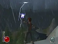 When controlling the protagonist, Rynn, on the ground, there are many ways in which the player can fight. Drakan: The Ancient Gates introduces target locking on enemies in order to focus Rynn’s hits, as well as magic spell castings, on the enemy at hand.[2] 30 spells can be learned, which require directional movement of the control stick on the PS2 controller.[3] Spells including Clone, Combust, and Fear are additions to the game often not seen amongst other RPGs.[4] There are 74 weapons that players can choose from, that are either acquired from shops or as loot, that include swords, clubs, bows, and even scimitars.[3] An additional fighting tactic that can be used on the ground is Arokh’s fire-breathing, when called-upon, but this can only be accessed later in gameplay.[2] Lastly, shields can be equipped to Rynn’s left arm, which can block most attacks, but reduce the speed at which offensive attacks are dealt. [5]
