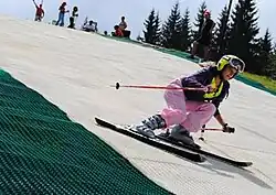 The most recent development has seen a crop of materials providing both impact protection and slope lubrication as well as the ability to perform turns, erect jumps, rails and quarterpipes and provide a ride that is closer to the feel of real snow. Neveplast is one of these, a newer material whose use is becoming even more common. This new type of mat, which uses a concentric arrangement of conical stems, is marketed for downhill, snowboarding and cross country skiing. Neveplast claims to be certified as having the same coefficient of friction between the surface and the ski as snow,[4] allowing the skier a good side grip, with the same skis used on the snow, and without the need for water. The Neveplast cooling hole has a comparable diameter to the F.I.S. slalom pole standards used for training and competition in both slalom and giant slalom. Neveplast is also used for school camps. This surface is modular and flexible, used frequently also for Urban freestyle parks.