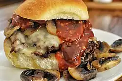 Gourmet hamburgers, like this one with mushrooms, Swiss cheese, and garlic ketchup, are considered to be part of the dude food trend