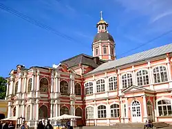 The Dukhovsky wing of the monastery, linking the Holy Trinity Cathedral and the Annunciation Church, was designed by Domenico Trezzini in the Petrine Baroque style.[1] Construction began on the Annunciation Church end of the building in 1717, and was completed in 1725 by Leonard Theodor Schwertfeger.[2] The ground floor held meeting rooms and monastic cells, the upper storey contained halls, the rooms of the governor, and more cells.[2] Plans for a new church to ease the overcrowding in the Annunciation Church had been under consideration since 1817, and in 1819 the halls adjacent to the Annunciation Church were combined into a single two-storey hall, with altar in its eastern part.[2][3]