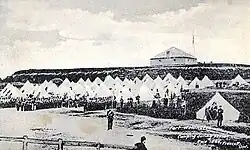 With the outbreak of the Rebellions of 1837–1838 the two regiments of Dundas Militia were again called out for the defence of the county. On 12 November 1838, men of the Hunters' Lodges came ashore in Prescott and took refuge in the windmill there, and a force of British Regulars along with the Grenville Militia, Glengarry Highlanders, Incorporated Militia, and Dundas Militia were dispatched to drive them back across the St Lawrence River. At the Battle of the Windmill, a force of 300 men from the 1st Dundas Regiment, commanded by Col. John Crysler, and the 2nd Dundas Regiment, commanded by Col. George Merkley, participated in the main attack on 13 November and were present for the surrender on 16 November.[1] Casualties from the Dundas Militia were three killed and eight wounded. It was during the Rebellion period that the regiments were collectively referred to as the Royal Dundas Militia, perhaps due to their gallant conduct at the battle, as evidenced on the flag of the 2nd Dundas Regiment.