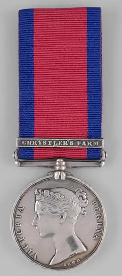 In 1848, the Military General Service Medal was created with a clasp for Crysler's Farm and the following men were awarded the medal for service with the Dundas Militia:[5]