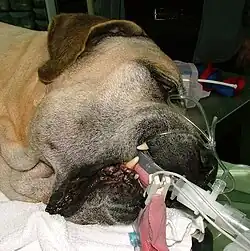 A geriatric mastiff with multiple tumors is being prepared for palliative surgery.