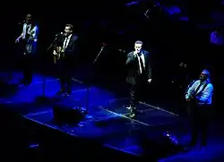 ![]() The Eagles in 2008 during their Long Road Out of Eden Tour. Left to right: Glenn Frey, Don Henley, Joe Walsh, Timothy B. Schmit, and (behind them) touring drummer Scott F. Crago | |